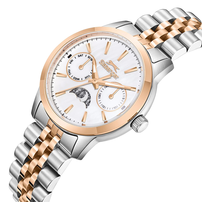 ساعت زنانه اسلازنجر مدل SLAZENGER SL.09.2462.4.05 با طراحی زیبا و شیک، گزینهای عالی برای بانوانی است که به دنبال ساعتی جذاب و مقاوم هستند. این ساعت دارای سه موتور فول تایم است که دقت بالایی در نگهداری زمان ارائه میدهد. قاب استیل ضدزنگ و بند استیل مقاوم آن بهطور خاص برای استفاده روزمره و رسمی طراحی شدهاند. همچنین، مقاومت در برابر آب تا 30 متر، این ساعت را در برابر پاشش آب و شستوشوی دست مقاوم میکند.