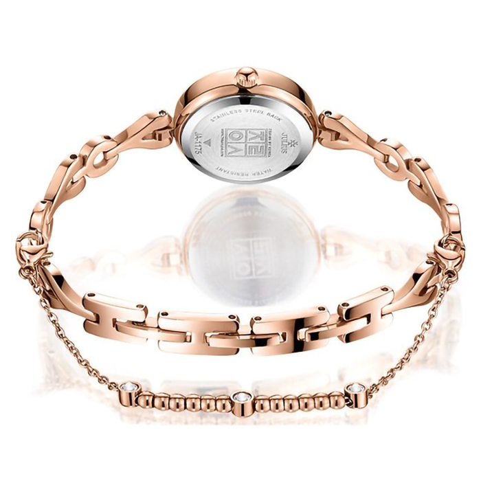 ساعت زنانه جولیوس مدل JULIUS JA-1175A یکی از مدلهای خاص و بسیار ظریف این برند محبوب است که با طراحی خلاقانه و کیفیت عالی، دل هر خانمی را میبرد. این ساعت با طراحی صفحه متفاوت و ترکیب رنگ چشمنواز، جلوهای کاملاً زنانه، لطیف و خاص دارد.