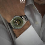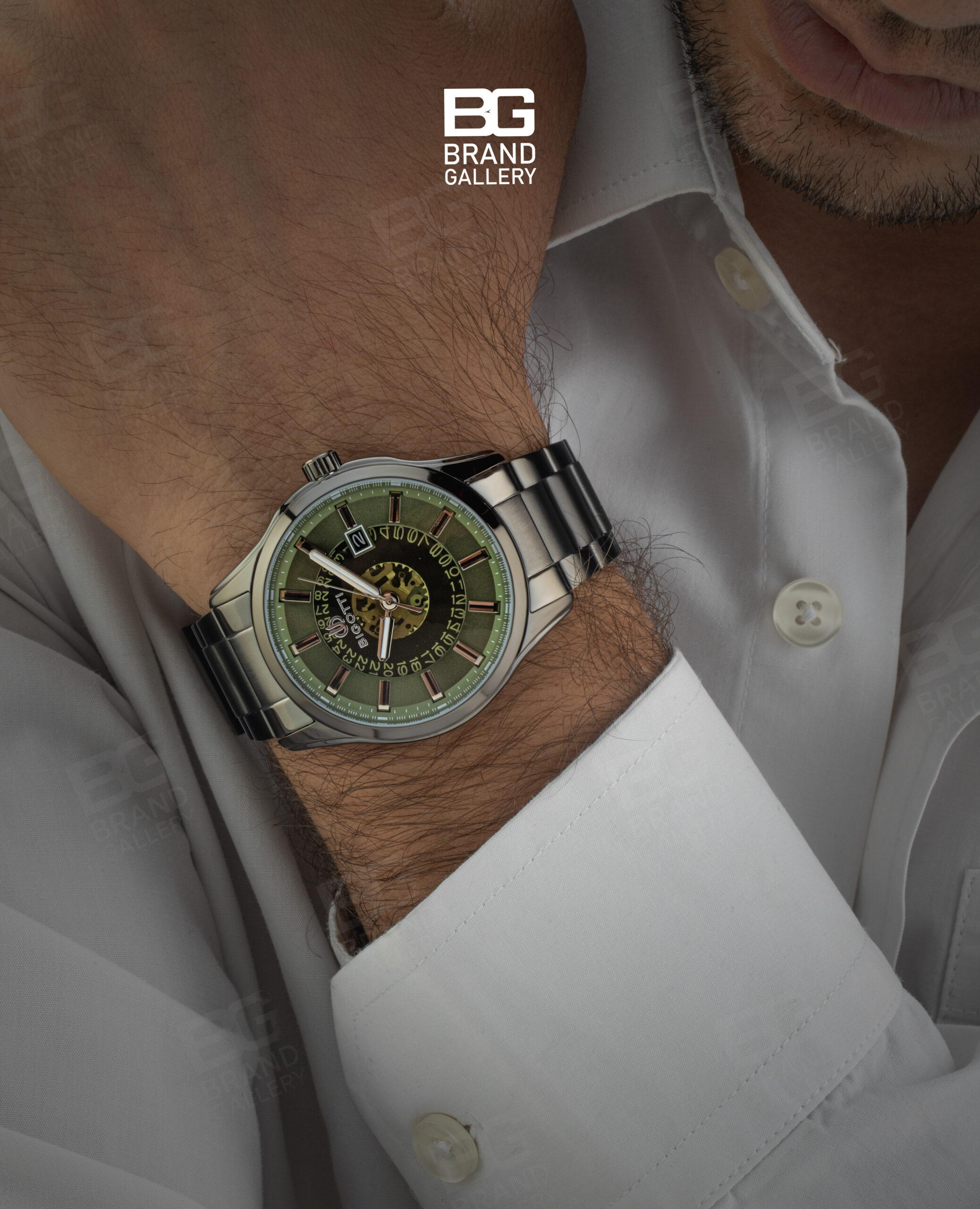بدنه و بند این ساعت از استیل ضد زنگ ساخته شده که علاوه بر مقاومت بالا، جلوهای رسمی و لوکس دارد. صفحهی سبز رنگ آن با عقربهها و نشانگرهای مینیمال، خوانایی بالایی را در هر شرایط نوری فراهم میکند.